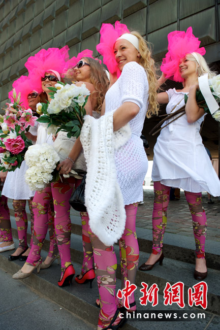 5月29日,在拉脫維亞首都里加,眾多金發美女身著艷麗裝扮在街頭游行,大秀嫵媚身材。