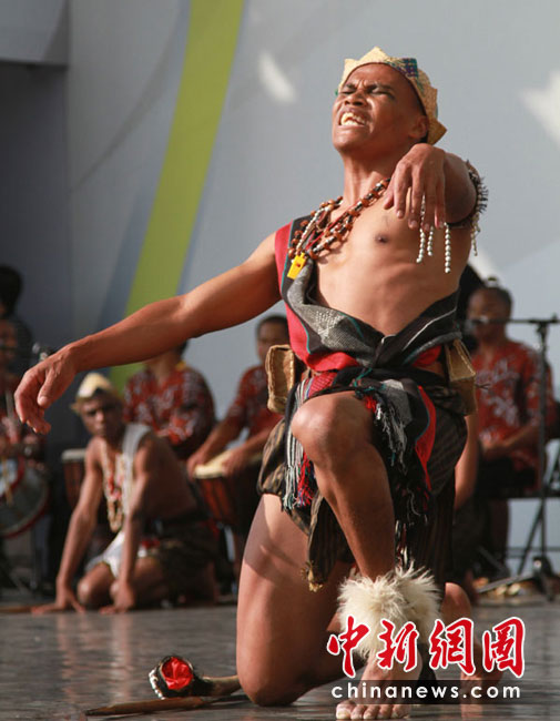 5月30日,馬達加斯加肯特思米諾歌舞團在世博園非洲廣場表演比洛傳統(tǒng)儀式,逼真的神態(tài)、激情的表演,博得許多參觀者稱贊。當天是馬達加斯加館日,世博中心內舉行了其國家館日活動,馬方和中方代表共同出席。中新社記者 殷春永 攝