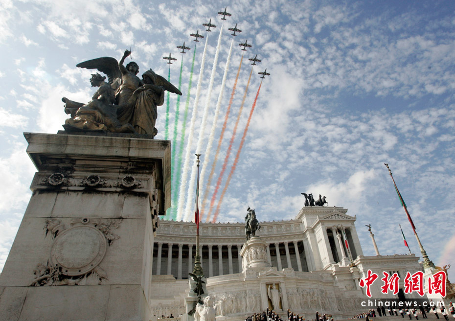 當地時間6月2日,意大利首都羅馬舉行盛大儀式慶祝國慶日。意大利“三色箭”飛行表演隊在首都上空進行了飛行表演。