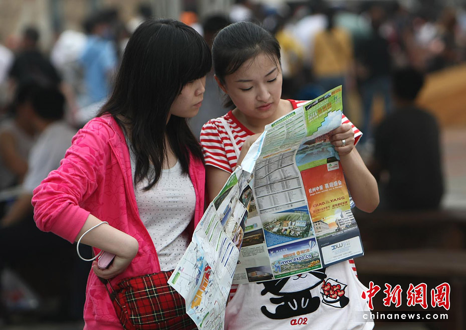 截至6月5日19點30分,上海世博會累計參觀者已超過1000萬人次。據悉,上海世博會的規劃用地為5.28平方公里,約242個國家和國際組織參展分布在浦東和浦西兩大區域。要想在這么大的地方找到自己想去的地方,那么世博地圖就是必須的裝備。圖為上海世博園內游客正在地圖上尋找自己要去的地方。中新社記者 杜洋 攝