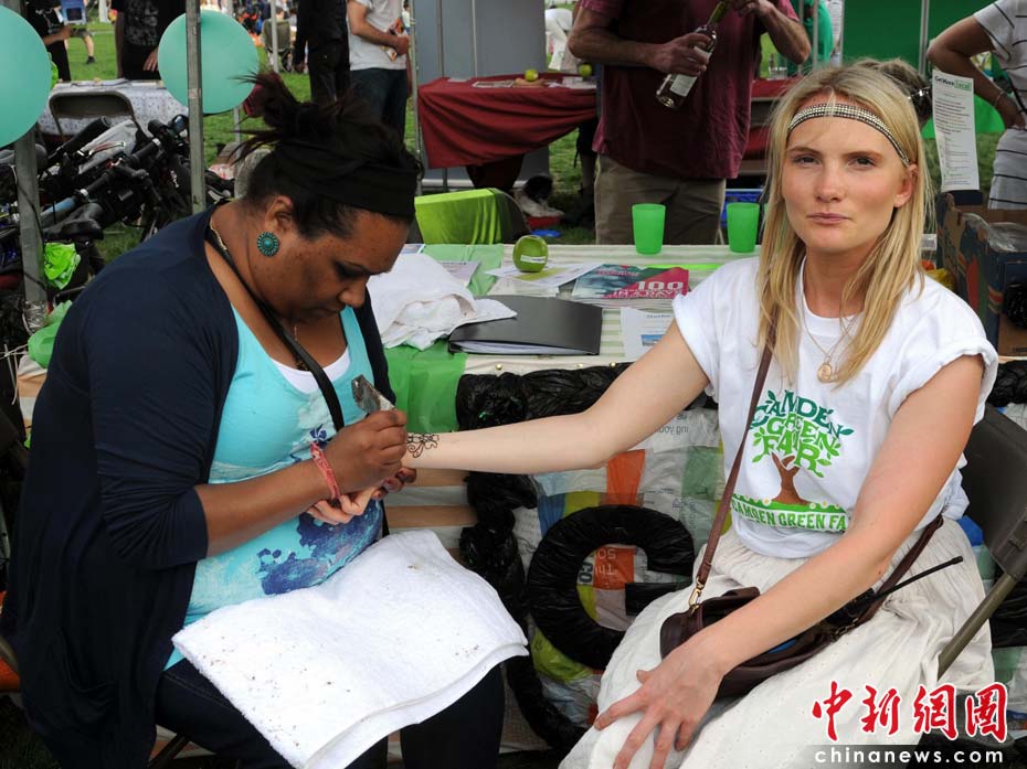 當地時間2010年6月6日,英國倫敦舉行卡姆登綠色市集(Camden Green Fair),這是英國倫敦每年環保領域的“重頭戲”。本屆市集的主旨是要喚起大眾對環境問題的關注,選擇更加可持續發展的生活方式。據活動主辦方預計,本屆市集將吸引來自英國各地和世界各國的2萬多人參加。圖為本次活動的組織者Sinclair Eiloart(右)在體驗印度手繪藝術。Fiona/攝 Fiona 馬小剛/文