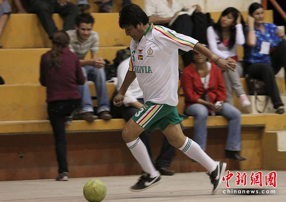 圖為2009年11月1日,玻利維亞總統莫拉萊斯當日在拉巴斯代表玻利維亞總統隊和巴西大使館隊踢了一場足球比賽。結果玻利維亞總統隊以10-2的比分獲勝。