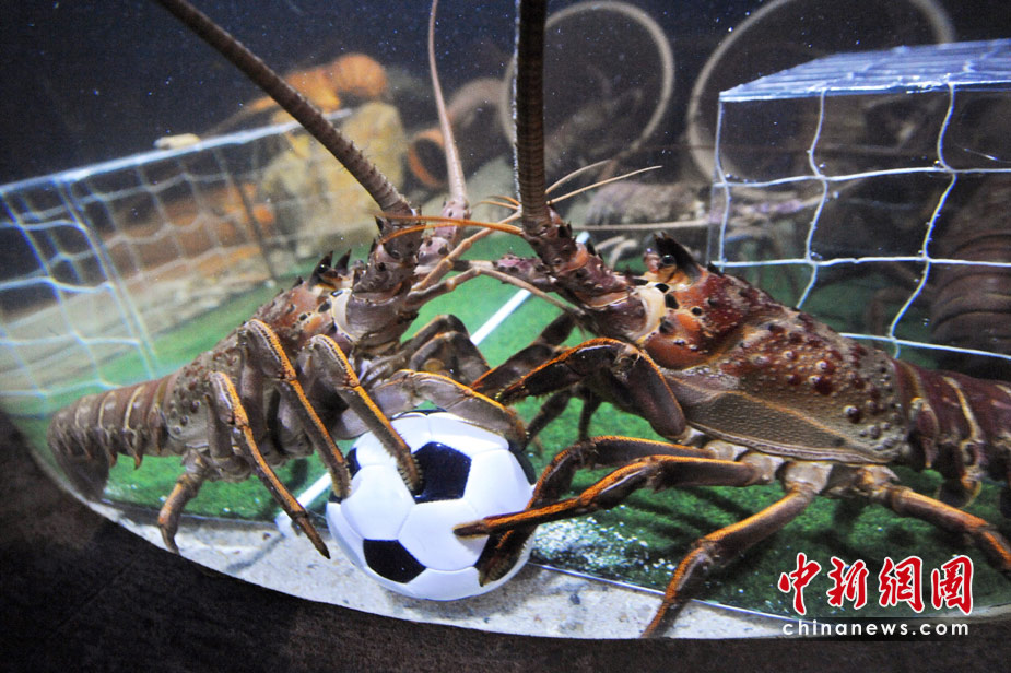 當地時間6月15日,德國北部,水族館里的海洋生物爭搶填滿飼料的足球。