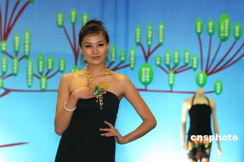 2007年11月1日,第七屆中國(guó)糧油精品展示交易會(huì)上演了多場(chǎng)特殊的時(shí)裝秀。模特們身上穿著的精美時(shí)裝,都是用大豆纖維和玉米蛋白合成纖維精制而成的。這種“食品時(shí)裝”在給觀眾帶來(lái)視覺(jué)沖擊的同時(shí)也從新的角度展現(xiàn)了糧食深加工的魅力。中新社發(fā) 鄭晨烜 攝