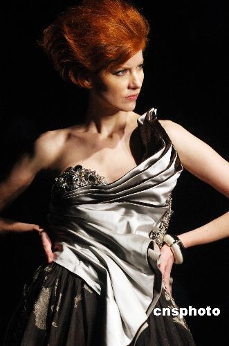 11月11日,北京中國國際時裝周2009春夏系列發布會推出董懷光高級時裝,創意來源于百年奧運,以奧運主體建筑結構的完美與大氣,將宏大的盛況和千年文化底蘊及建筑優美的幾何立體元素融入到設計構思中。圖為模特展示董懷光高級時裝發布會作品。中新社發 錢興強 攝