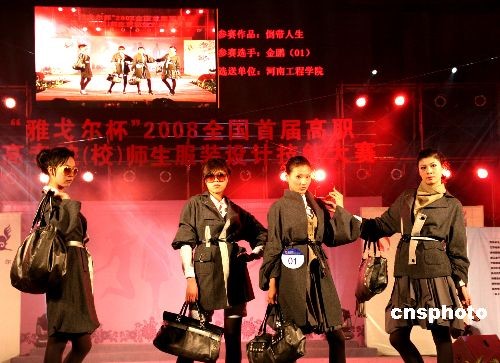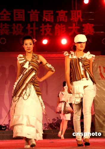 12月11日晚,中國高職院校服裝設計技能大賽在揚州舉行。共有來自江蘇、安徽、河北、江西、湖北、廣西、北京、重慶、新疆、內蒙古等10多個省市自治區的53所高職高專院校設計作品911件,經專家組初評,有64個系列作品入圍決賽,最終評選出2個金獎、12個銀獎、24個銅獎和最佳效果圖獎、最佳工藝獎等6個單項獎。中新社發 崔佳明 攝