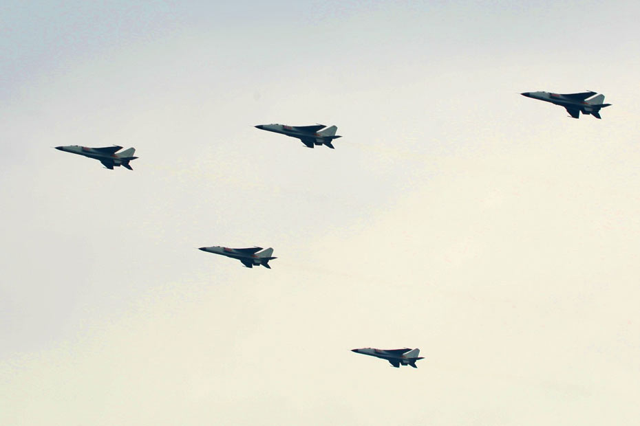 4月23日下午,為紀念中國人民解放軍海軍成立60周年而舉行的海上閱兵在青島附近黃海海域舉行。海上檢閱式分兩個階段,第一階段為海上分列式,檢閱中國海軍的艦艇和飛機;第二階段為海上閱兵式,檢閱來自14個國家的21艘艦艇。圖為海軍航空兵震撼登場。中新社發 宋吉河 攝