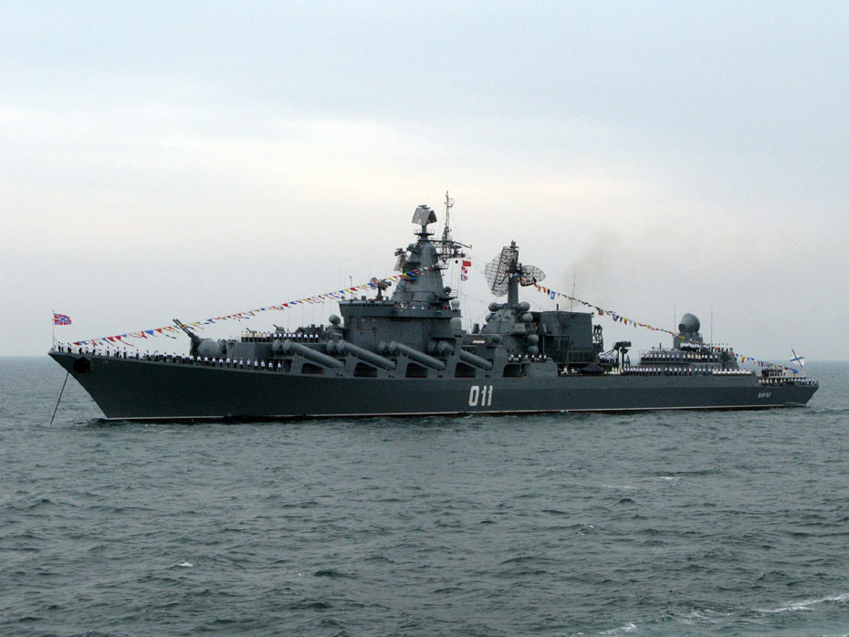 4月23日下午,為紀念中國人民解放軍海軍成立60周年而舉行的海上閱兵在青島附近黃海海域舉行。圖為舷號011俄羅斯“瓦良格”號導彈巡洋艦。 中新社發 琥珀旺旺 攝