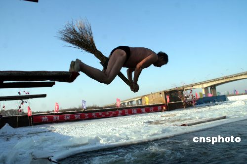 1月15日下午在哈爾濱公路大橋冬泳浴場,國內外游客激情觀看冬泳。冬泳愛好者用各種姿勢做跳水表演,引來游客的歡呼聲,冬泳運動員不怕今天零下20多度的嚴寒,為讓游客滿意就是再冷也要多游兩次,好讓游客高興而來盡興而走。中新社發 姚庭山 攝