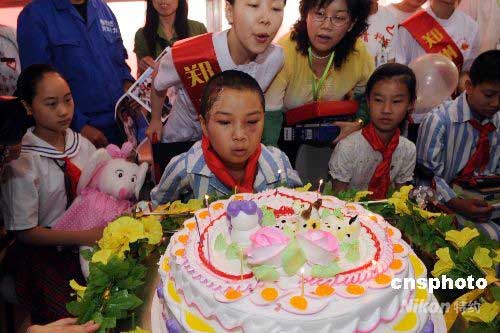 5月29日,來自四川青川縣喬莊鎮(zhèn)的李新婷在鄭州骨科醫(yī)院病房內(nèi)過十一歲生日,醫(yī)護人員、熱心市民為這位來自四川災區(qū)的小傷員送上了生日蛋糕、小書包等禮物。中新社發(fā) 李志全 攝