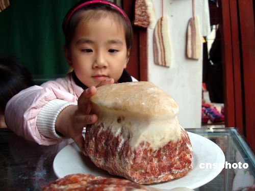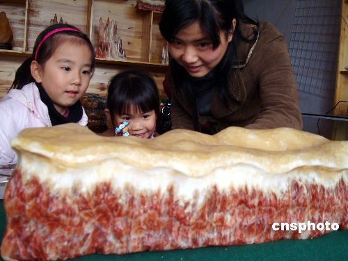 12月13日,在江蘇蘇州古鎮同里一家奇石店內一種酷似豬肉的天然石頭吸引了眾多游客。據悉,這些“豬肉石”是在地質運動過程中與其他礦物質接觸色化而成,不但長有“肉皮”,而且“瘦肉”和“肥肉”之分,呈現出多層次,十分逼真。中新社發 王建康 攝