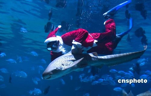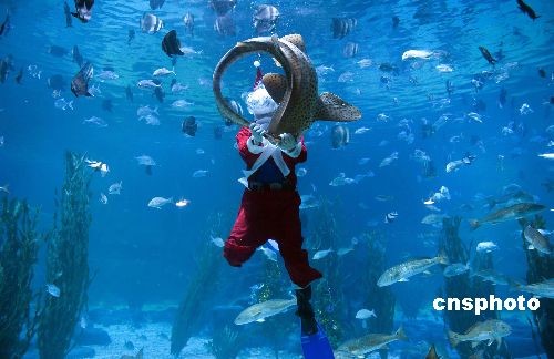 12月24日,圣誕節(jié)來臨,“圣誕老人”在杭州極地海洋公園與海洋動物共度圣誕,不騎麋鹿改騎魚。中新社發(fā) 王磊 攝