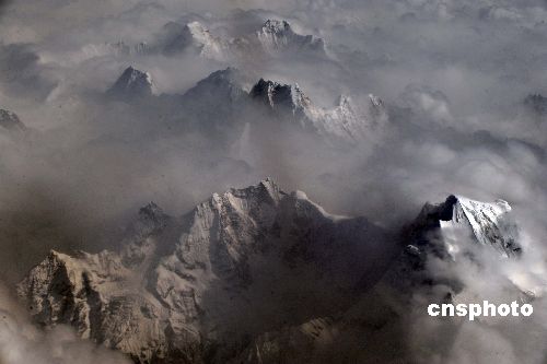 一月五日,青藏高原出現多云天氣,從高空俯瞰高聳云端的雪域高峰美如仙境。中新社發 廖攀 攝