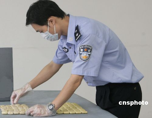 近期,廣州海關連續查獲多起毒品走私案件。從九月二十五日至十月九日,廣州海關連續查獲14宗毒品走私案,抓獲十五名涉案嫌疑人,僅人體藏匿海洛因走私入境案就達九宗。其中一人毒品滯留體內十九天,另一人體內藏毒一千九百多克,時間之長、重量之多,在廣州海關緝私局偵辦的人體藏毒走私案件中均屬前所未有。中新社發 陳國華 攝