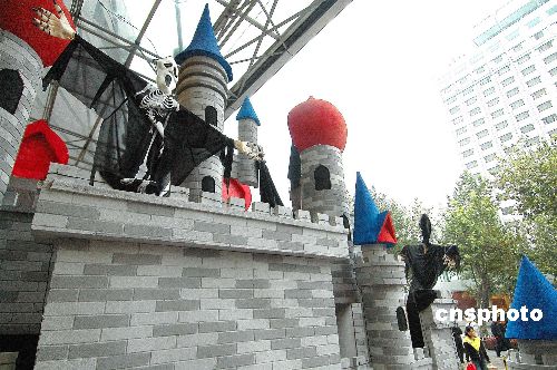 10月30日,兩座“鬼堡”出現(xiàn)在杭州一商店廣場。隨著“萬圣節(jié)”到來,杭州部分商家用各種形式的“鬼節(jié)”造型吸引顧客,抓住商機(jī)賺錢。中新社發(fā) 引煒 攝