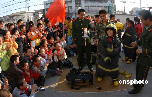 11月5日,小學(xué)生在消防戰(zhàn)士的幫助下試穿消防服,零距離接觸消防裝備。當(dāng)日,山東省棗莊市臺(tái)兒莊區(qū)消防大隊(duì)舉辦“消防開(kāi)放日”活動(dòng),1000余名中小學(xué)生走進(jìn)消防大隊(duì)與消防裝備零距離接觸,消防隊(duì)員還將對(duì)中小學(xué)生進(jìn)行消防演示、講解消防法規(guī)、消防常識(shí)及火災(zāi)撲救方法等消防安全知識(shí)。中新社發(fā) 高啟民 攝