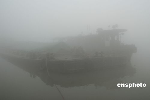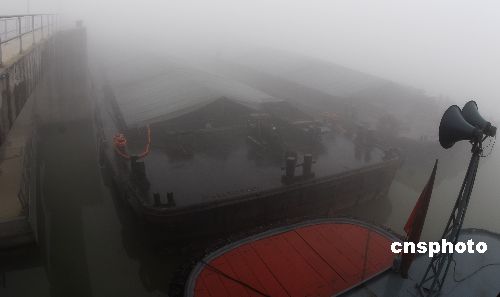 11月7日晨,一船隊因濃霧彌漫無法航行。當日,大運河山東臺兒莊航段濃霧彌漫,能見度不足20米,萬年船閘和臺兒莊船閘從早晨開始全線停止放船。停航造成至少近300艘船只短暫滯留,濃霧給船隊通航和船民生活帶來不便。中新社發 高啟民 攝