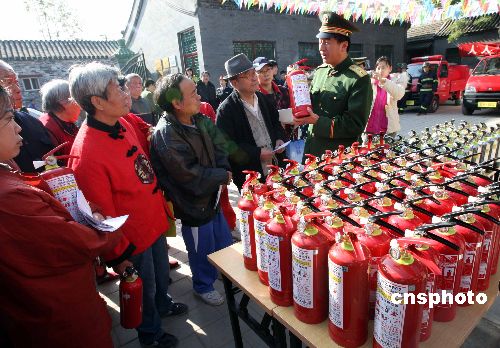 十一月八日,“11.9”消防宣傳日前夕,北京西城消防官兵來到屬地的社區,為民眾發放滅火器并現場演示滅火器的使用方法,宣傳家庭中火災的撲救等常識,提高市民的防范意識。中新社發 任海霞 攝