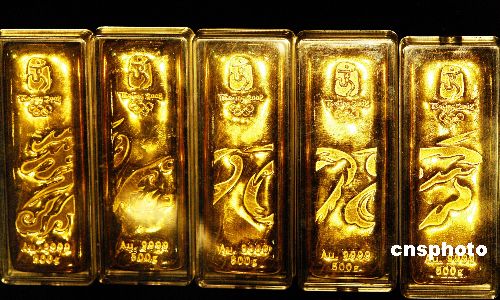 2007年11月10日,北京金博會上的全套“北京奧運金”本色系列組合成一條完整的龍亮相。據稱“龍尾”奧運金條將在本月陸續在全國上市。“北京奧運金”是世界上第一套具有奧運概念的紀念金條,其每組的含金量均為99.99%,按重量分為50克、100克、500克和1000克四種規格,每組限量發行2008公斤。中新社發 馬健 攝