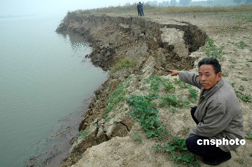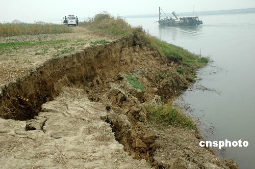 11月13日,受非法采砂影響,淮河淮南黑張段近千米河灘地出現(xiàn)坍塌,許多河灘地出現(xiàn)裂縫,隨時(shí)都可能坍塌,河灘地與淮南大堤的距離在逐漸縮短,一旦汛期來(lái)臨,將對(duì)防汛工作構(gòu)成威脅。為此,水利部門建議,打擊處理非法采砂行為,海事部門要加強(qiáng)對(duì)“三無(wú)”采砂船的整治,沿淮各區(qū)、鎮(zhèn)政府也要聯(lián)動(dòng),對(duì)采砂船實(shí)行屬地管理,這樣才能有效打擊處理非法采砂行為。中新社發(fā) 柳青青 攝