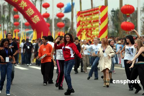 2007年11月16日,外國朋友在海南瓊海跳起歡樂之舞。為期三天的第八屆中國海南歡樂節(jié)將于當天下午開幕,海南全省放假一天。當天上午,出席開幕式的各國朋友和海南各族群眾在歡樂節(jié)主會場情不自禁地跳起歡樂之舞。中新社發(fā) 蒙鐘德 攝