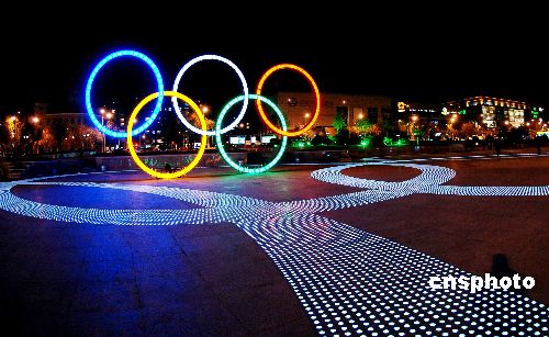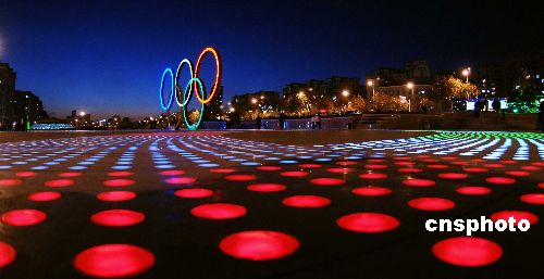 11月27日,大連市奧林匹克廣場流光溢彩。日前,大連市利用高科技對奧林匹克廣場地面進行了改造,在地面新建5個直徑為38米,能變換多種色彩的奧運五環標志圖案,成為大連市夜間格外壯觀的一景。中新社發 劉德斌 攝