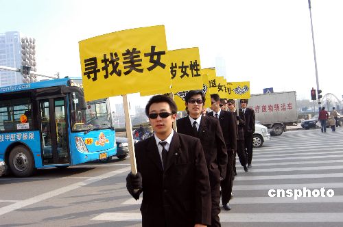12月4日,在山東濰坊勝利街一繁華路段,八名身穿西裝、戴著墨鏡的“酷男”舉著“尋找美女”的牌子,招來不少路人的目光。據悉,這是某商場的另類促銷。中新社發 王志德 攝