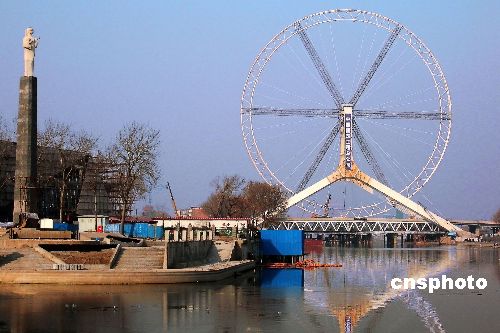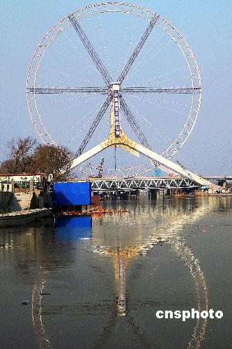 12月18日,位于天津三岔河口的重要景觀工程——“天津之眼”摩天輪輪盤安裝完畢,轉入負重測試和摩天輪座艙、電力驅動裝置安裝階段!疤旖蛑邸 摩天輪直徑110米,其最高點距離地面約120米。輪盤外掛48個透明座艙,可供384人同時觀光,是名副其實的“天津之眼”。 中新社發 田齊 攝