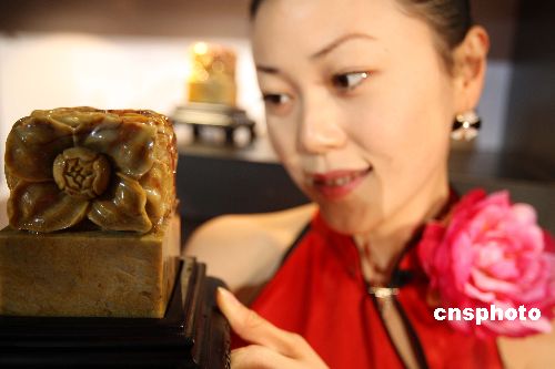 十二月二十日,北京奧組委在奧林匹克大家庭總部飯店北京飯店舉行壽山石奧運(yùn)特許商品“中國牡丹印”首發(fā)儀式。歷史悠久、雕工精美的壽山石印,承載著“中國印·舞動(dòng)的北京”與印鈕部分國色天香、雍容華貴的牡丹交相輝映。此次隆重推出的“牡丹印”是壽山石奧運(yùn)文化精品系列的首批代表作,限量2008枚。該印采用中華國石之首壽山石與國花牡丹相結(jié)合,選材為“中華印石三寶”的壽山芙蓉石脈,可稱得上是精品中的精品。中新社發(fā) 任海霞 攝