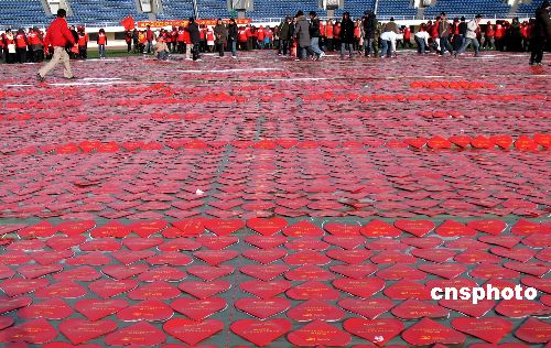 十二月二十九日,一個名為“共享健康·愛心接力”大型公益活動在北京奧體中心體育場和廣州奧體中心體育場同時展開。一千位來自中國各地的老人作為“愛心大使”,把載滿愛心故事的十萬顆小紅“心”貼成兩顆巨大的“愛心”,以沖擊吉尼斯世界紀錄。中新社發 黎仲顏 攝