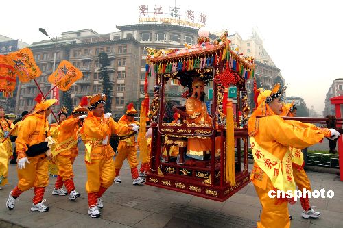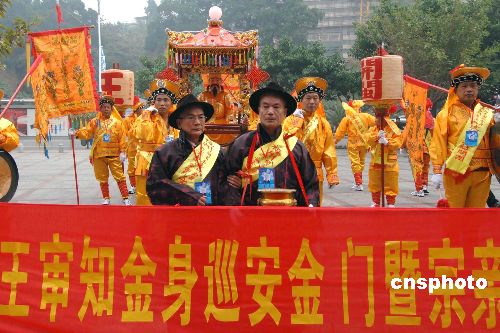 一月九日上午,閩王王審知金身在七十余位福州王氏宗親文化交流訪問團成員護送下,在廈門上船經“廈金”航線直航金門巡安,進行為期四天的交流活動。這是閩王金身首次赴金門巡安,期間福州與金門兩地王氏宗親將共同進行祭祖、學術交流等活動。中新社發 王東明 攝