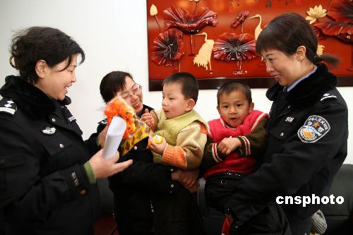 1月10日,沈陽市公安局社區警務支隊民警到市兒童福利院為無戶口的31名棄嬰解決戶口問題,并送去落戶手續。社區警務支隊的民警還為孩子們送去了精心選購的各種禮物。這些被遺棄的孤兒,多數無法查找到他們的身源,沒有戶口就如沒有一個合法的公民身份。為了不影響這些孩子今后的成長、生活、學習、就業。沈陽市公安局社區警務支隊采取特事特辦的方式,解決棄嬰們的后顧之憂。到目前為止已為263名棄嬰辦理了落戶。中新社發 黃金昆 攝