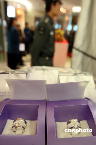一月十一日,“相印五環(huán) 百年華嫁”奧運特許商品結婚鉆飾新品在北京上市。這是第一款奧運婚慶主題概念的鉆石類奧運特許商品,突破了貴金屬特許商品市場只有收藏性紀念品的局限,創(chuàng)新性填補了市場空白。中新社發(fā) 任海霞 攝