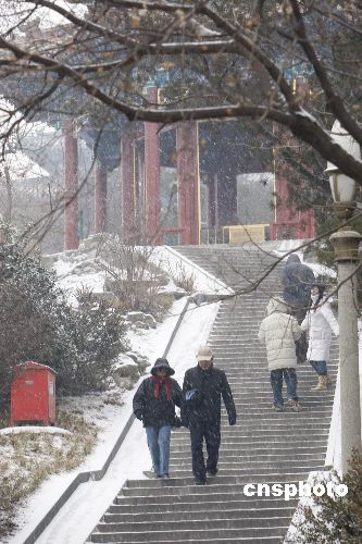 1月17日,北京景山公園的游人踏雪游玩,興致不減。當日,北京迎來了2008年的第一場降雪,伴著寒風,小雪很快灑滿了京城的大街小巷。中新社發 杜洋 攝