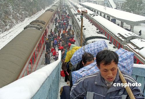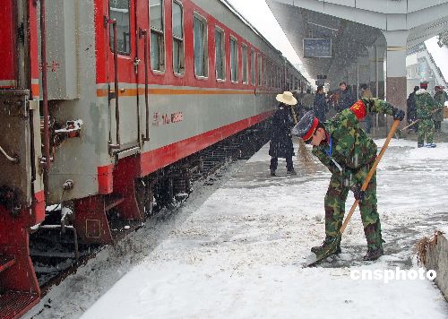 2008年1月27日,湖北宜昌再次普降大雪,宜昌市火車站積極迎戰大雪保鐵路春運安全,讓旅客旅途平安。中新社發 劉君鳳 攝