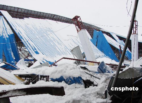 1月28日晨,連續多日的降雪,使江蘇儀征雪深達20多厘米,厚厚的積雪壓塌了儀征一家具城部分屋頂,幸末有人員傷亡。中新社發 黃建林 攝