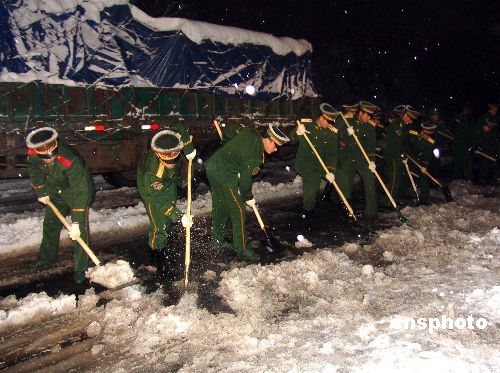1月28日下午16時,武警江蘇總隊1500余名官兵緊急奔赴南京長江二橋除雪抗災。南京長江二橋是南北交通大動脈,更是向南京市區運輸新鮮農產品的主要通道,每天車流量達到5萬余次。暴雪已使二橋交通中斷,近兩千車輛被迫停泊在風雪中。截至1月29日凌晨2時許,經過武警官兵連續10多個小時的艱苦奮戰,約30公里的高速公路重新暢通。 中新社發 唐占軍 攝