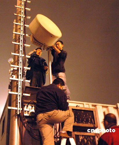 圖為廣州移動通訊運營商在廣州火車站廣場啟動應急通信設備,確保網絡暢通。