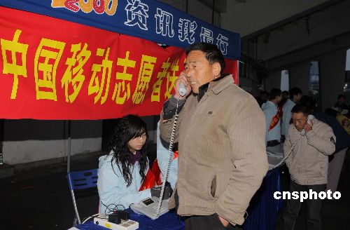 近期受連續雨雪和凍雨天氣影響,大批旅客滯留廣州及韶關等地。廣州移動啟動現場應急通信保障,向滯留旅客提供免費電話服務,向家人報平安。同時發送定向短信,第一時間通報春運動態。中新社發 譚穎 攝
