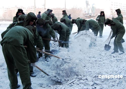 1月31日,解放軍官兵和交警在鏟除路面積雪。自1月12日以來,持續不斷的降雪、冰凍氣候,給河西走廊中部的甘肅臨澤縣人民生產生活和交通安全造成了嚴重影響。災情發生后,當地黨委政府積極采取多項措施,清除冰雪,確保道路交通安全暢通。中新社發 李自明 攝