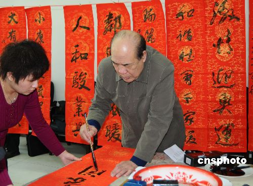 2月1日,中國書法家協(xié)會組織著名書法家二十余人到北京近郊農(nóng)村書寫春聯(lián),把喜慶送到普通農(nóng)民家庭。中新社發(fā) 楊佐桓 攝
