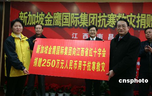 2月3日,正在遭受五十年罕見的冰雪災害的江西省收到了首筆海外僑胞的救災捐款250萬元人民幣,該筆捐款由中國僑商投資企業協會常務副會長、新加坡金鷹國際集團主席陳江和慷慨解囊,以幫助受災民眾度過難關。中新社發 吳慶才 攝