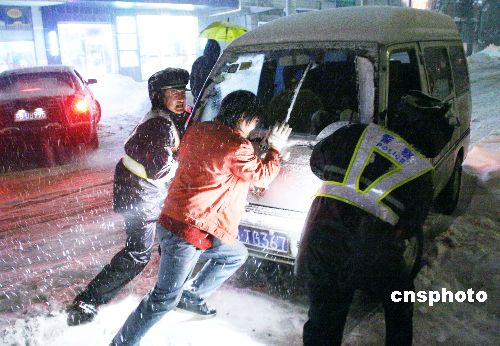 2月1日晚,交巡警在推動一輛陷于雪堆中的汽車。江蘇宜興市再次遭受暴雪襲擊,宜興市公安交巡警大隊的眾多交巡警冒雪到交通要道指揮交通,為群眾排憂解難。中新社發 丁煥新 攝