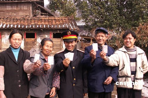 2月8日,凱里車務(wù)段職工上門為凱里市紅巖村村民吳章海等送來預(yù)定返程火車票。近日,貴州連續(xù)出現(xiàn)了50年罕見的冰凍,為確保農(nóng)民工按時拿到火車票,成都鐵路局凱里車務(wù)段開展了多項便民措施,確保返程農(nóng)民工不但走得了而且走得好,真正做到“平安和諧”春運。中新社發(fā) 姜澤鵬 攝