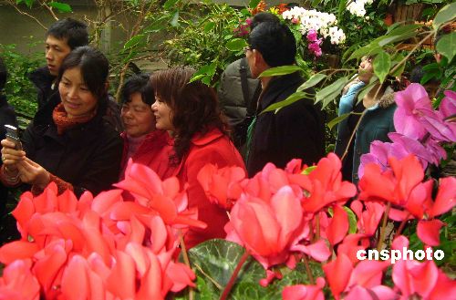 2月8日大年初二,游人在上海植物園“2008迎春花展”上賞花。中新社發 嚴大明 攝