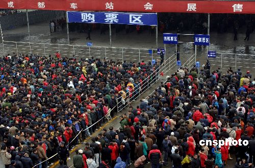 2月8日,成都站售票處排隊買票的旅客。成都站在原有售票大廳、臨時售票大廳和學(xué)生售票廳共62個售票窗口向出行旅客售票的基礎(chǔ)上,從當日開始至2月28日,又在成都市沙灣會展中心增設(shè)了臨時售票處,為節(jié)后出行和返程旅客出行順利提供方便。中新社發(fā) 曹寧 攝