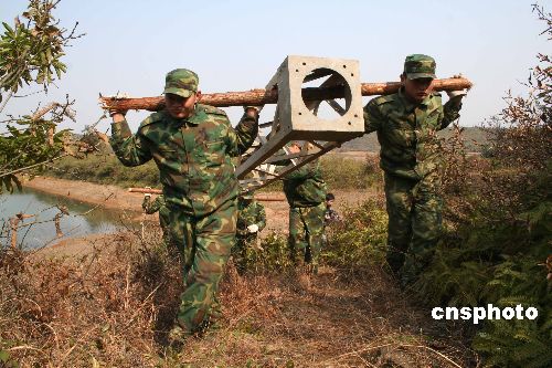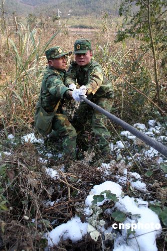 2月13日,南京軍區入贛指戰員在江西東鄉溫松線電力搶修現場進行清障。江西7個設區市用電告急,恢復供電迫在眉睫。2月12日起,南京軍區派出1.2萬名官兵奔赴江西7個設區市電力搶修現場,同江西省軍區1.3萬余名官兵、民兵預備役人員一道,參加抗災救災活動。中新社發 何江華 攝
