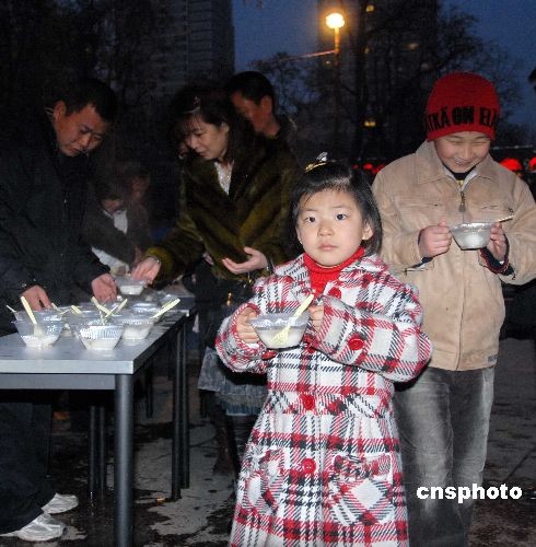 2月20日晚,大連勞動公園“元宵佳節鬧花燈”游園燈會在荷花池舞臺擺上大鍋煮元宵,上百名市民與游客在這里同品元宵宴,觀賞游園燈會。中新社發 王錫增 攝