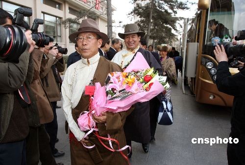 3月2日,出席十一屆全國人大一次會議的西藏代表團抵達駐地北京京西賓館,受到熱烈歡迎。前者為新雜·單增曲折代表(西藏自治區人大副主任),后者是多吉次珠代表(拉薩市市長)。中新社發 任晨鳴 攝