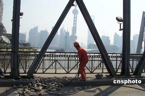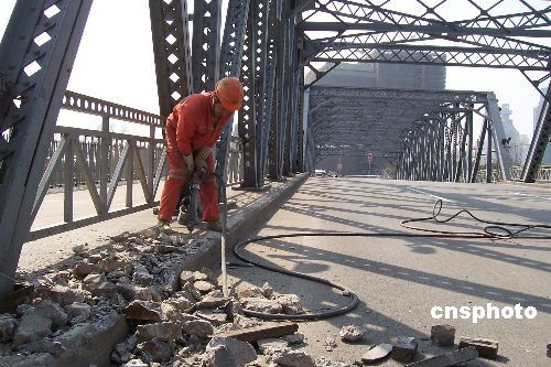 3月3日,上海外白渡橋移橋前期施工正在展開。施工人員在去除橋面混凝土層,外白渡橋在拆下一些零部件后,將被整體吊裝,分兩部分用駁船移至船廠大修。中新社發 周東潮 攝